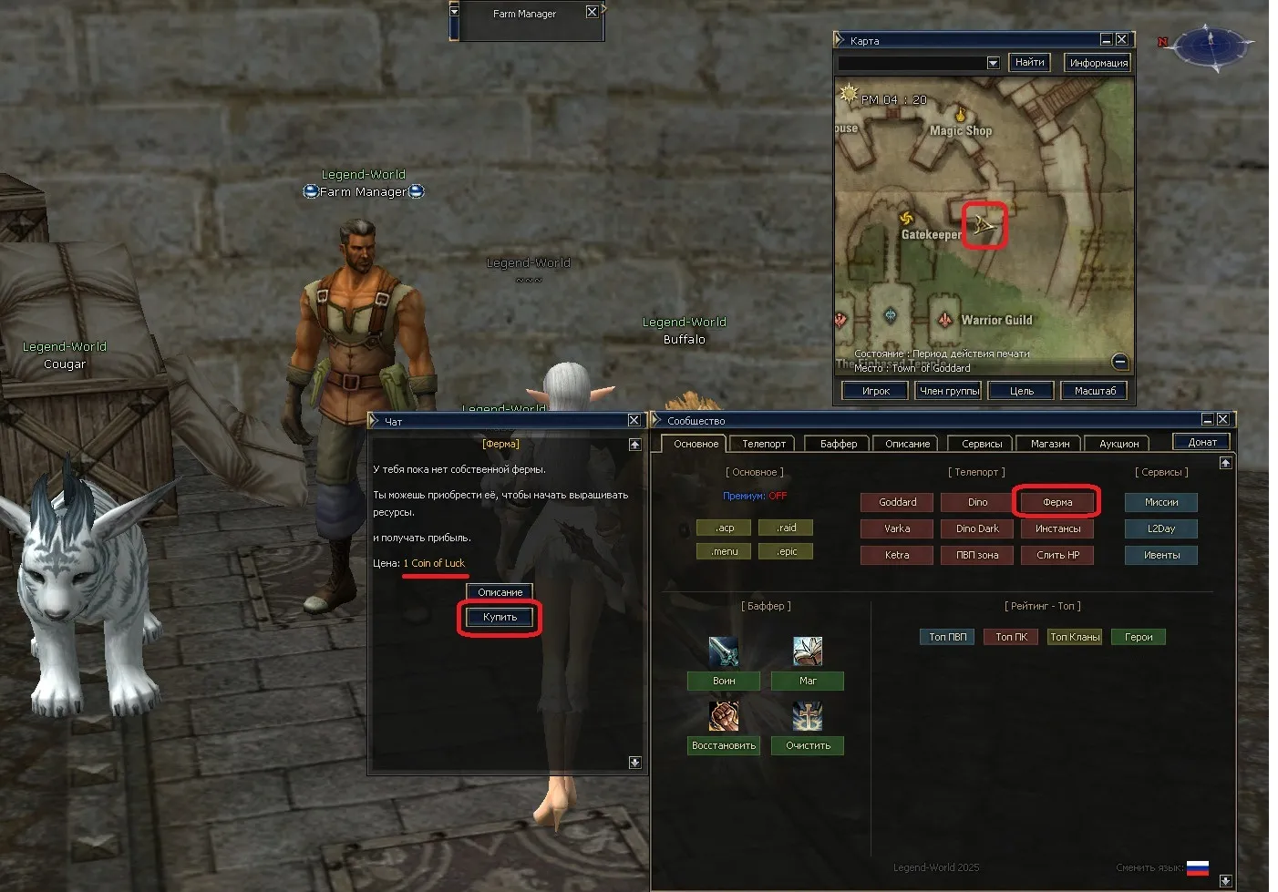 Чтобы начать, вам необходимо приобрести ферму у Farm Manager за 1 Coin of Luck (NPC находится в главном городе). После покупки вы получите возможность входить в персональный инстанс фермы.